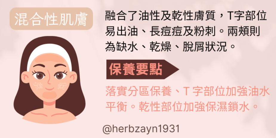 混和性膚質融合了油性及乾性膚質的特性,在T字部位及下巴容易出油、毛孔較粗大,也容易長痘痘及粉刺。而在兩頰及眼周則是較為缺水、乾燥甚至會有脫屑狀況。