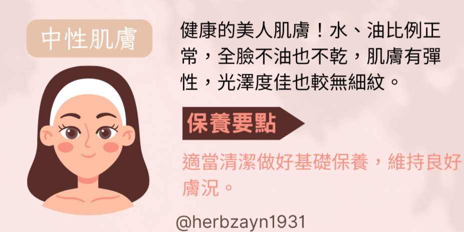 中性肌膚其實就是比較健康的膚質,也因此有美人肌之稱。肌膚的水、油比例正常,皮膚較細緻、肌膚有彈性、光澤度佳,不容易有讓人困擾的肌膚狀況發生。