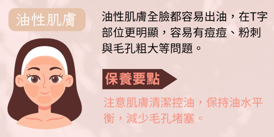 油性肌膚全臉都容易出油,在T字部位可能會更為明顯,這類型肌膚通常有長痘痘、粉刺與毛孔粗大等問題合併出現。但皮膚較不容易過敏、脫屑,也不容易長皺紋。
